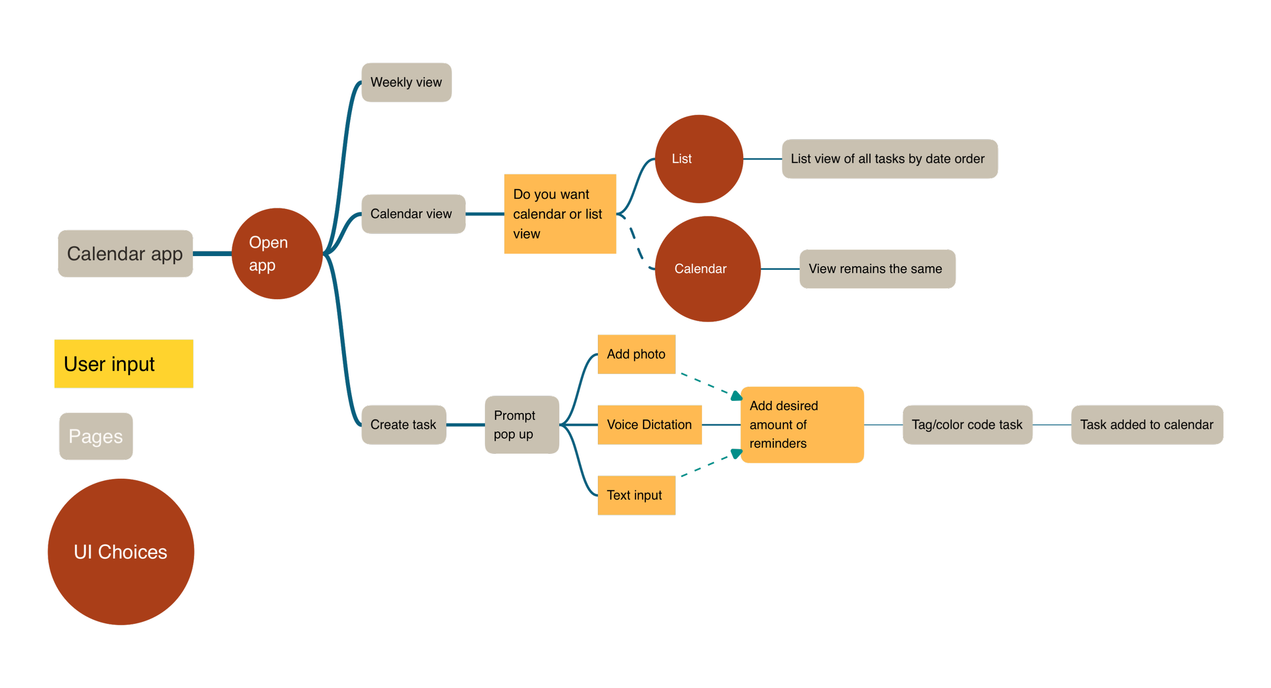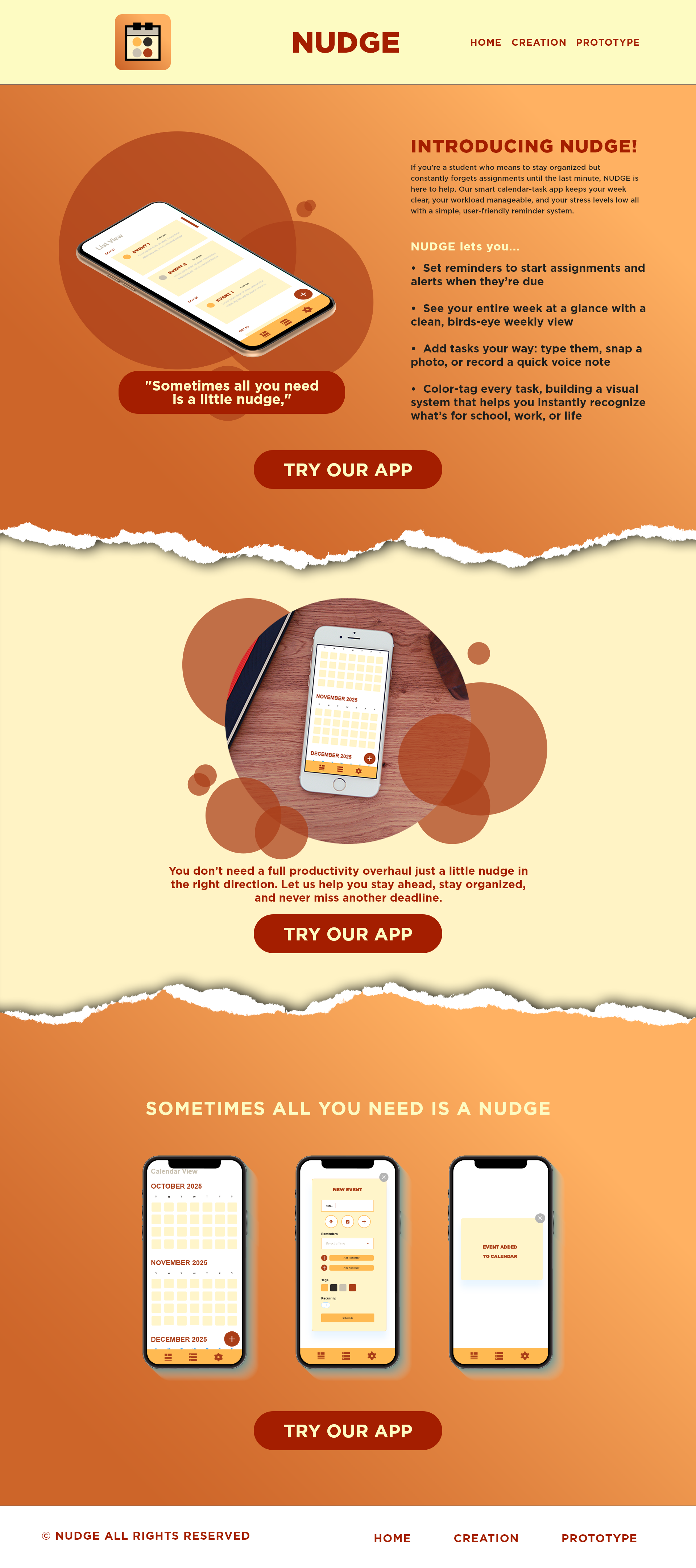 The final result is a warm-toned, thoughtfully structured calendar experience that stands apart from the typically cool, blue-heavy interfaces common in productivity apps. Based on user input, I implemented a warm color palette to create a more inviting visual environment while also reducing blue-light exposure. Through research-driven decision-making and iterative design, NUDGE transforms calendar management into a frictionless habit rather than a chore. The project demonstrates my ability to synthesize user research into actionable design solutions, create cohesive systems from concept to prototype and design with both emotional experience and functionality in mind.